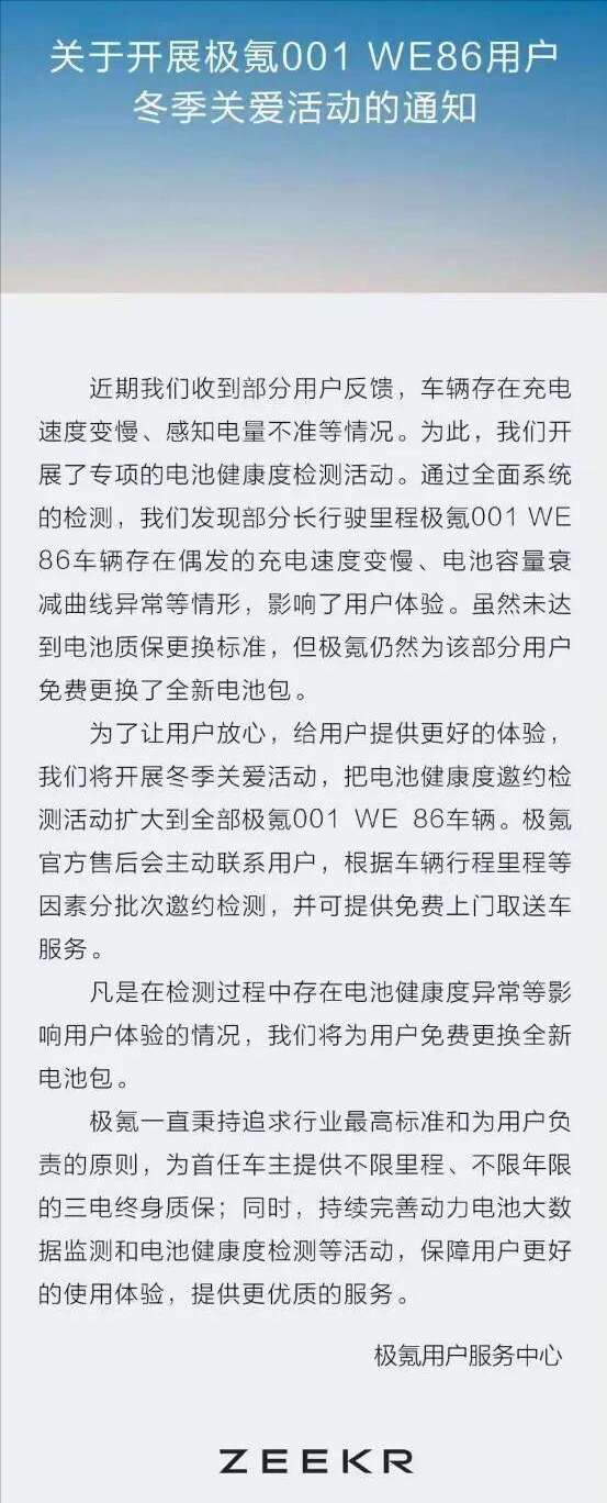 但合作背后,质量隐患已现——2024年12月,极氪曾公告称,部分极氪001WE86车型(搭载欣旺达电池)存在充电速度变慢、电池容量衰减异常等问题,即便未达质保更换标准,仍为用户免费更换电池包,并启动全量车主检测。