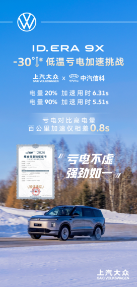 在极寒测试场地中,ID. ERA 9X的核心优势来自其动力系统——基于大众“机皇”EA211增程器与65.2 kWh增程专用宁德时代电池组成的全新“黄金增程系统”。测试在电池低电量(SOC低于20%)、环境温度零下30℃的双重极限条件下进行,ID. ERA 9X依然能够稳定输出强劲动力,未出现常见的“掉劲感”或输出断层。百公里加速成绩达到6.31秒,对比同等环境下高电量状态(SOC 90%)仅衰减0.8秒,有效缓解了极寒、亏电环境下新能源车型动力衰减的问题;而在正常工况下,这一差值更是仅0.1秒,动力表现几乎无损失。