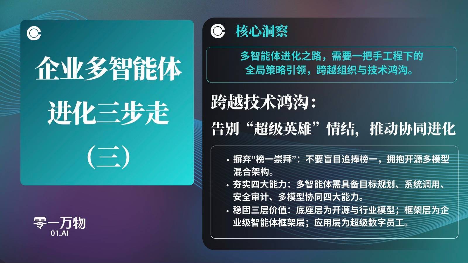 零一万物中国区解决方案和交付总经理韩炜表示,企业智能体正从“单点工具”进化为“智能管理系统”。多智能体架构的本质,是重构了企业的组织形式,让AI从“单点提效”转向“全局优化”。这不仅是技术的跃迁,更是组织生产关系的重组。