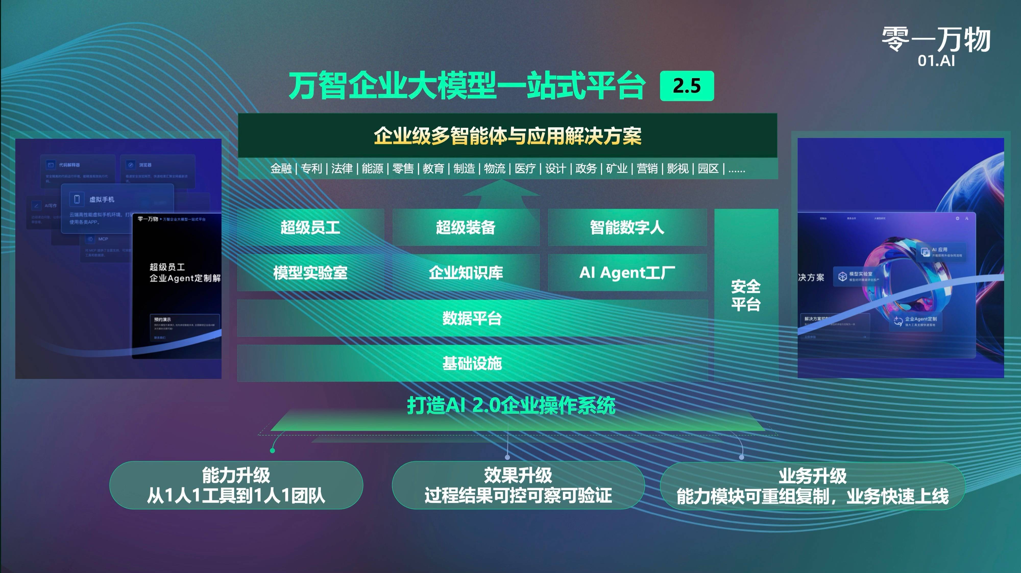 基于上述六大预判,零一万物万智企业大模型一站式平台(以下简称万智平台)正式升级至2.5版:企业级多智能体成为平台的核心企业应用之一,好比Office之于Windows系统。