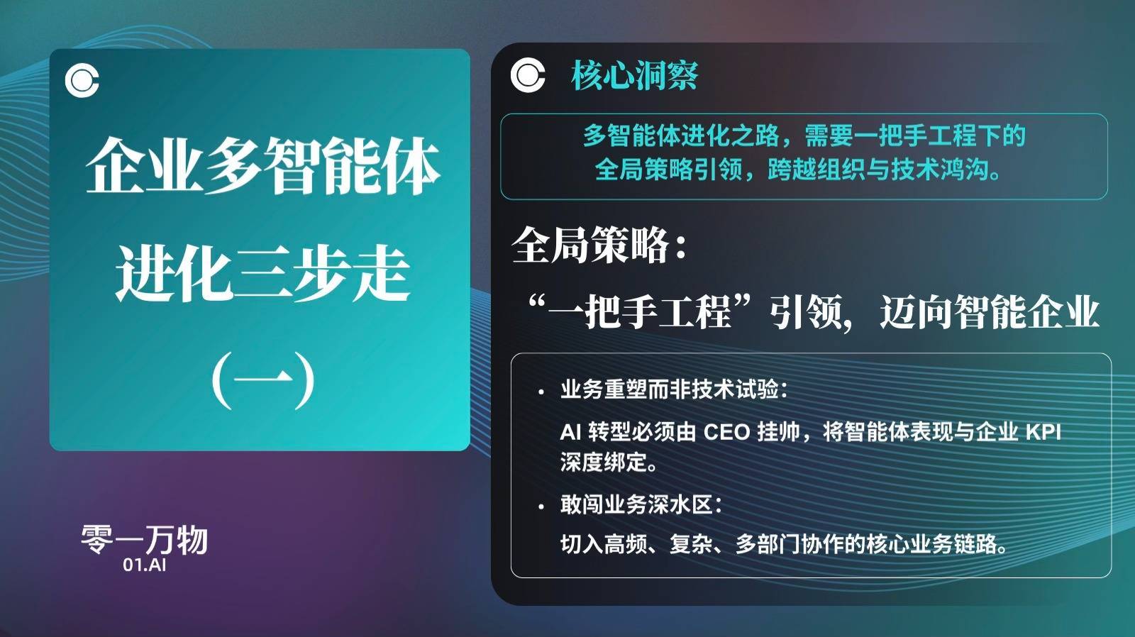 第一步,确立“一把手工程”下的全局策略。 零一万物认为,AI数智化转型绝非单纯的技术试验,而是深刻的业务重塑。企业必须由CEO亲自挂帅,将多智能体的表现与企业的核心KPI深度绑定。在落地初期,便要敢于切入高频、复杂、多部门协作的核心业务链路,以全局视角指引技术与业务的融合。